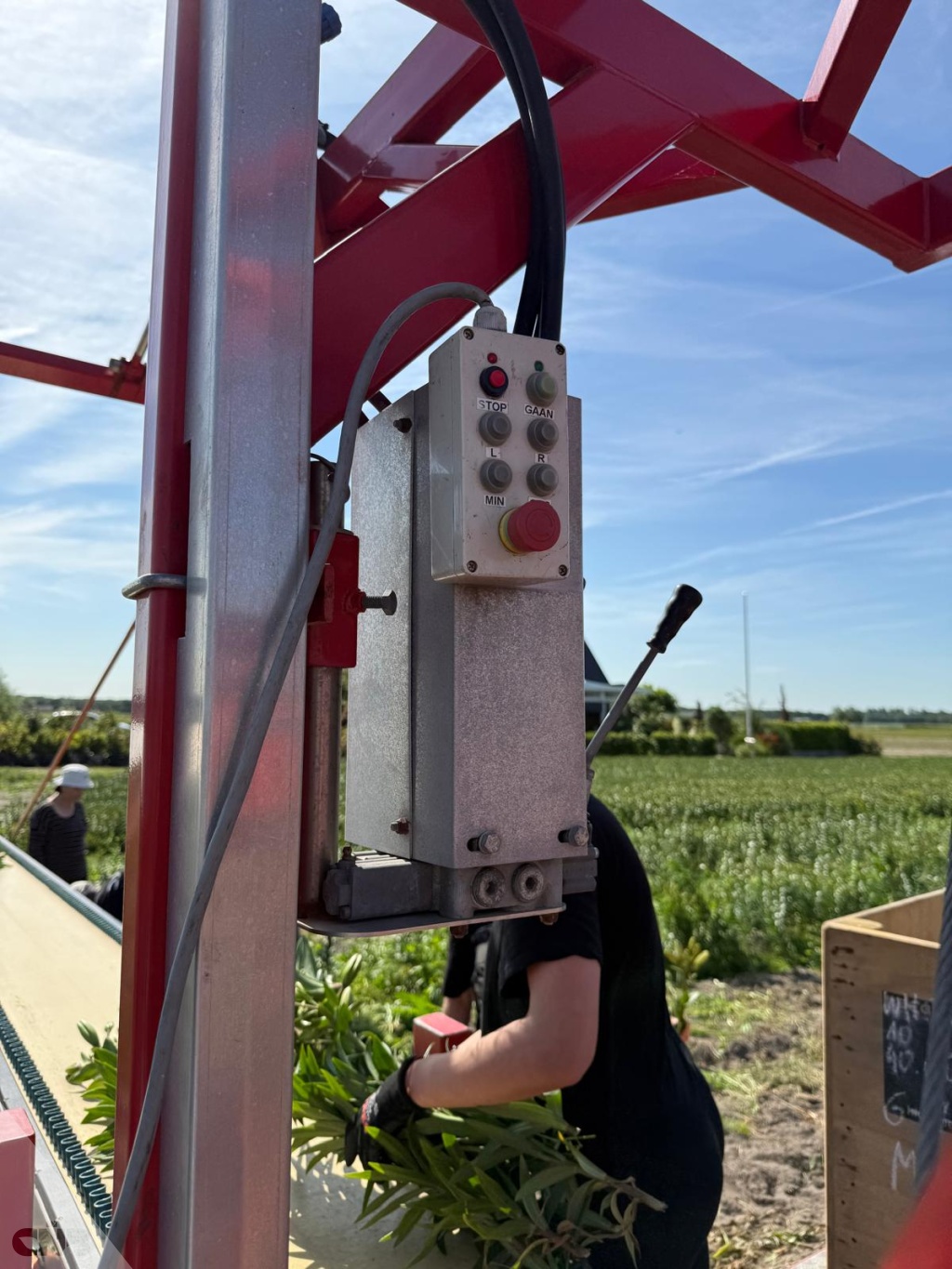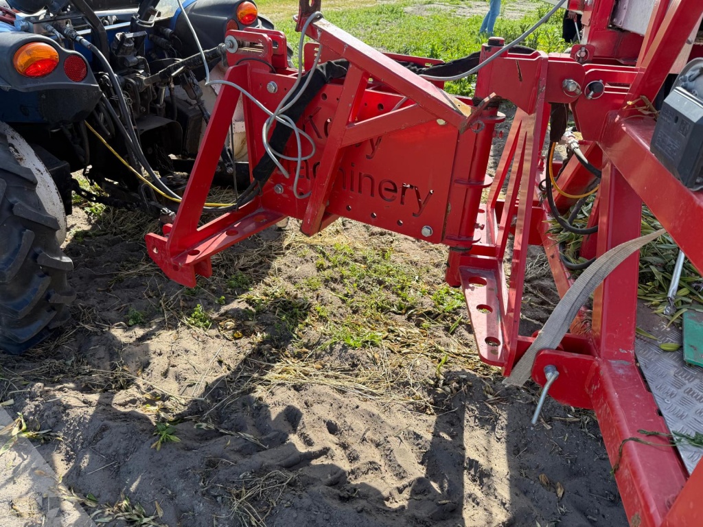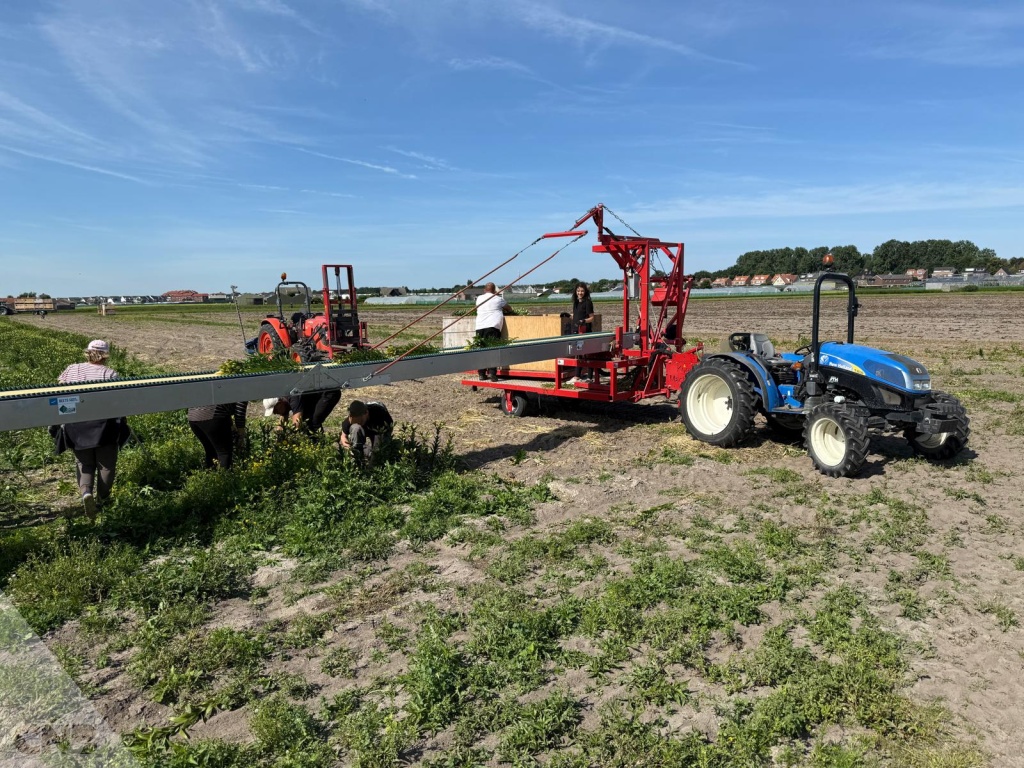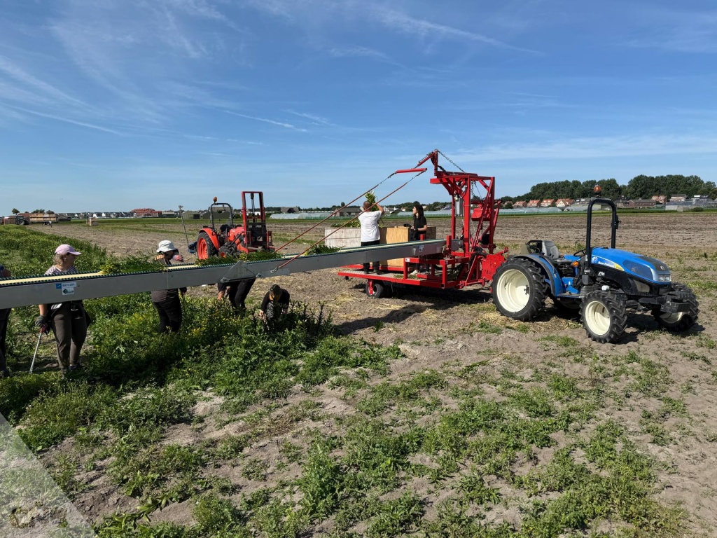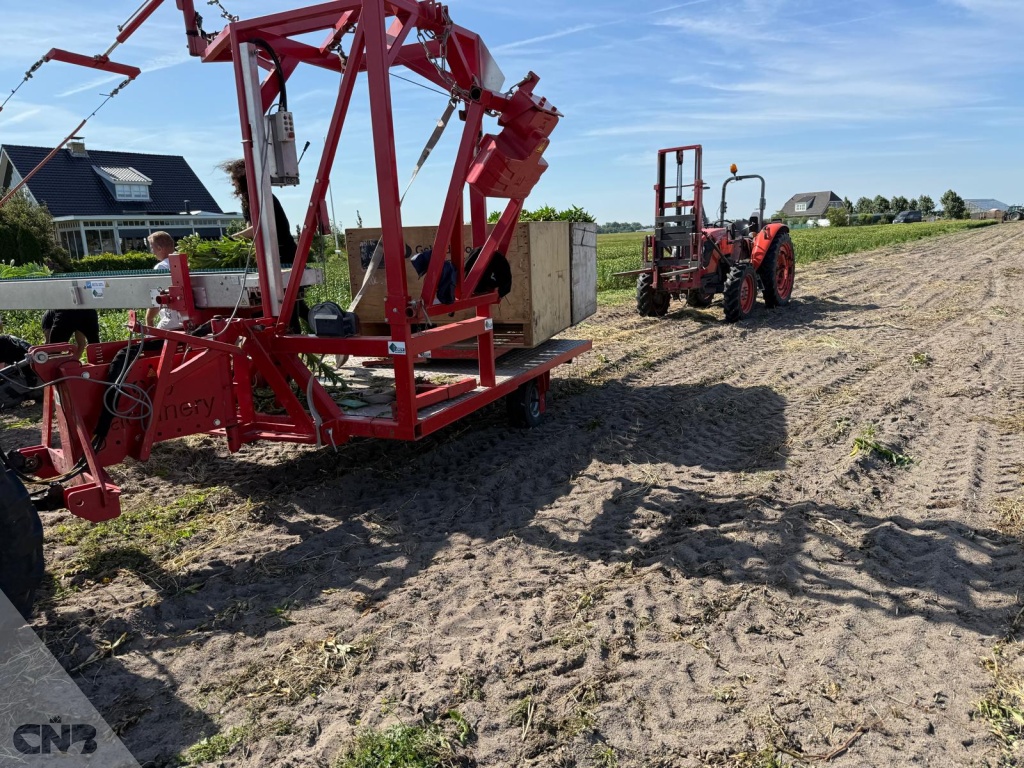 Complete oogstband met oogstwagen met bediening voor tractor tijdens oogsten.roteerder voor de kuubkisten